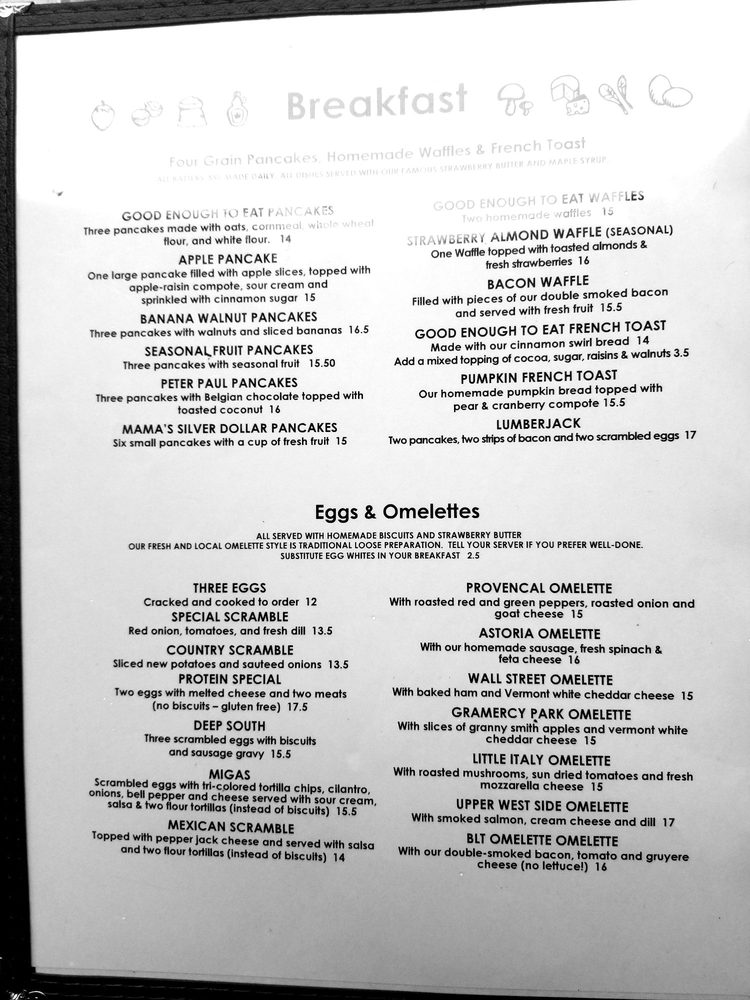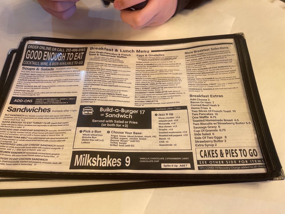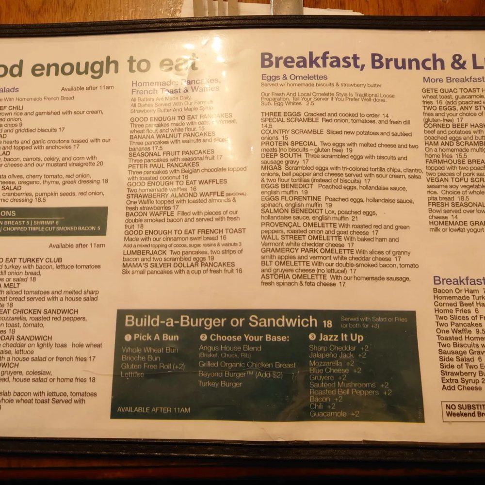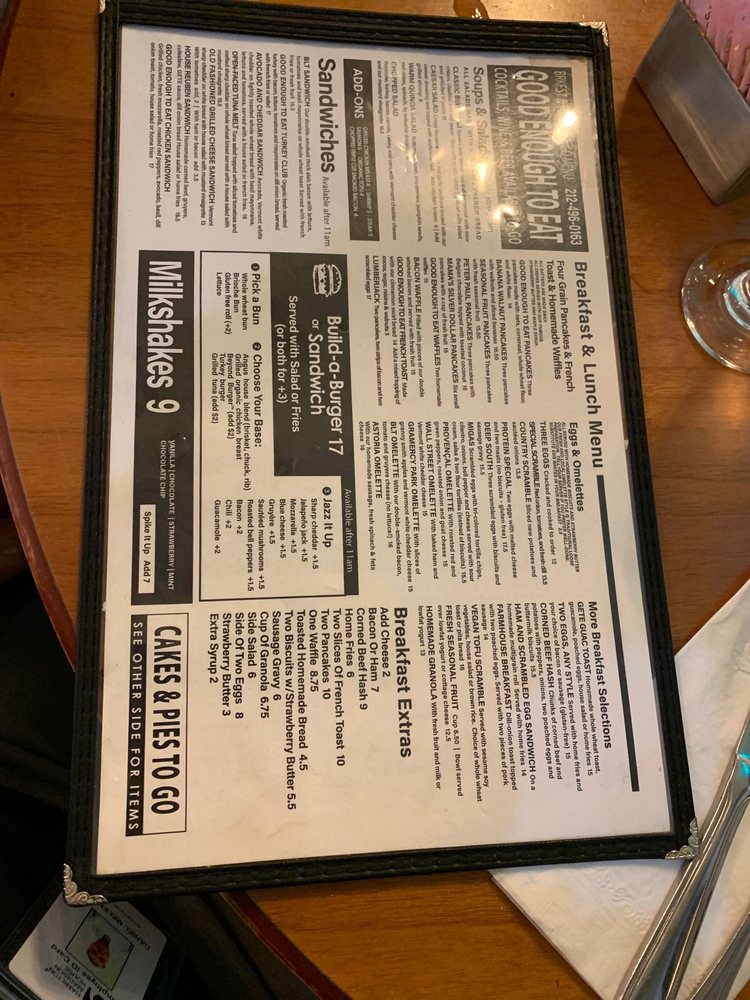 Good Enough to Eat, located in New York City, offers an extensive menu of American comfort food with a focus on breakfast and brunch options. This women-owned establishment has a casual setting with moderate noise levels, making it ideal for group gatherings, families, and even dogs as they are allowed on the premises. With options for vegan and vegetarian dishes, Good Enough to Eat strives to cater to a diverse range of dietary preferences. The menu features a variety of appetizers like gazpacho, spinach and artichoke dip, and crispy calamari to start your meal. The salads, including the Harvest Chopped Salad and Gete Chopped Salad, are fresh and flavorful. Don't miss out on their famous Mac and Cheese, baked to perfection in a creamy mornay sauce. Good Enough to Eat provides a welcoming atmosphere, delicious food, and excellent service, making it a must-visit spot for breakfast and brunch enthusiasts in the area.